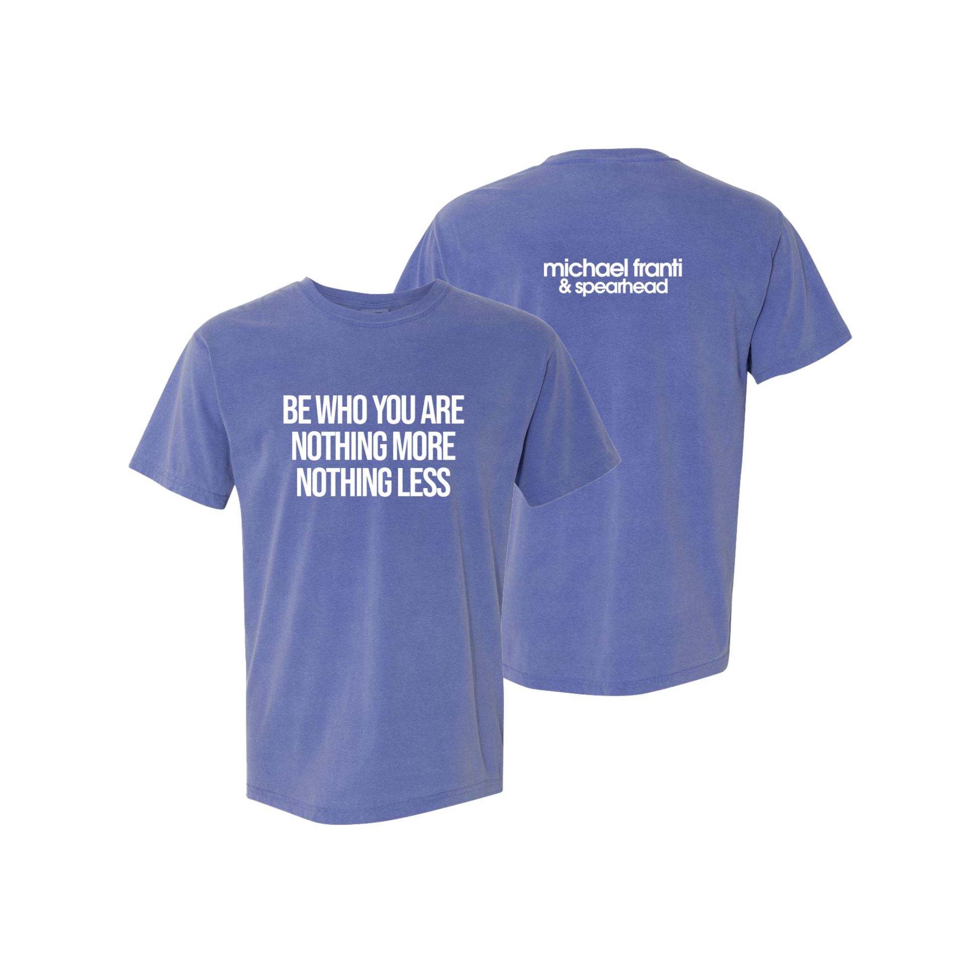 Periwinkle 100% cotton relaxed fit shirt with text: "BE WHO YOU ARE NOTHING MORE NOTHING LESS"