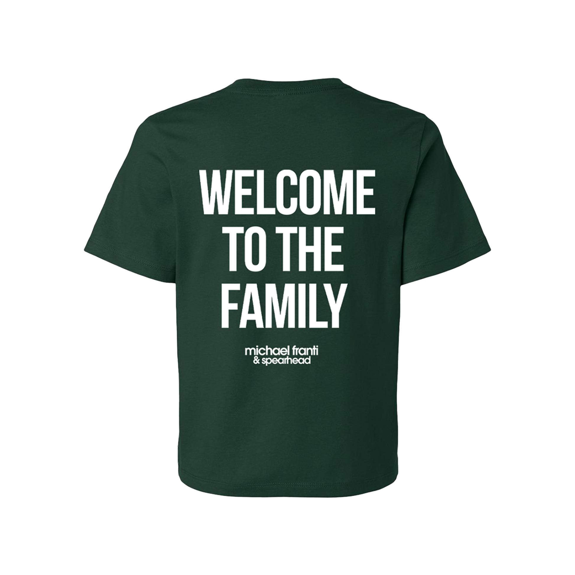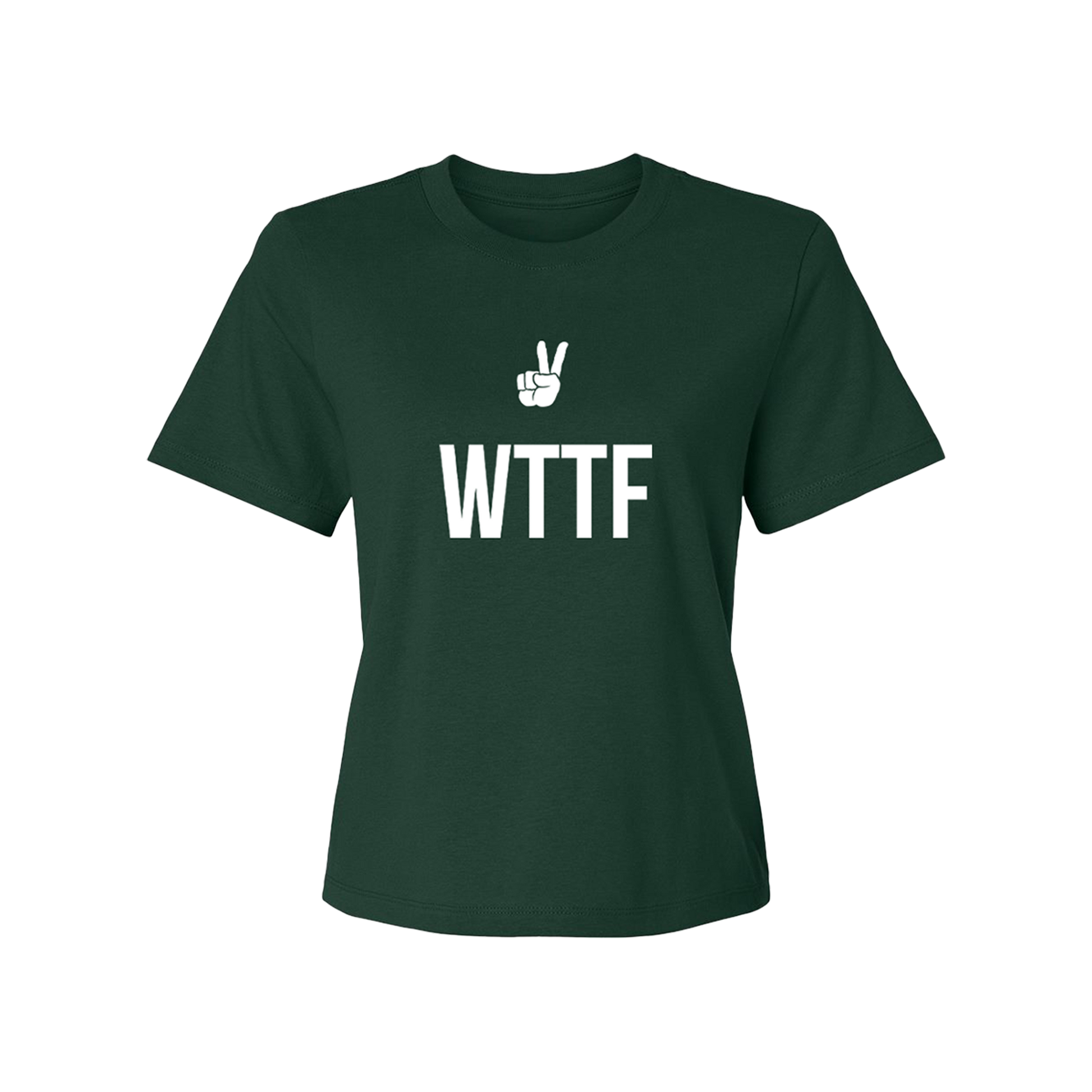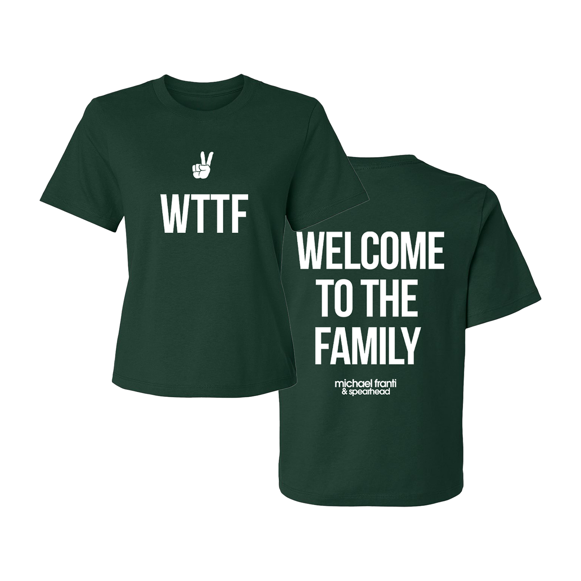 Forest green 100% airlume combed and ring-spun cotton ladies t-shirt with boxy fit and semi-dropped shoulder. The front design includes a peace hand sign and "WTTF" on the front. On the back, in bold letters "Welcome To The Family"