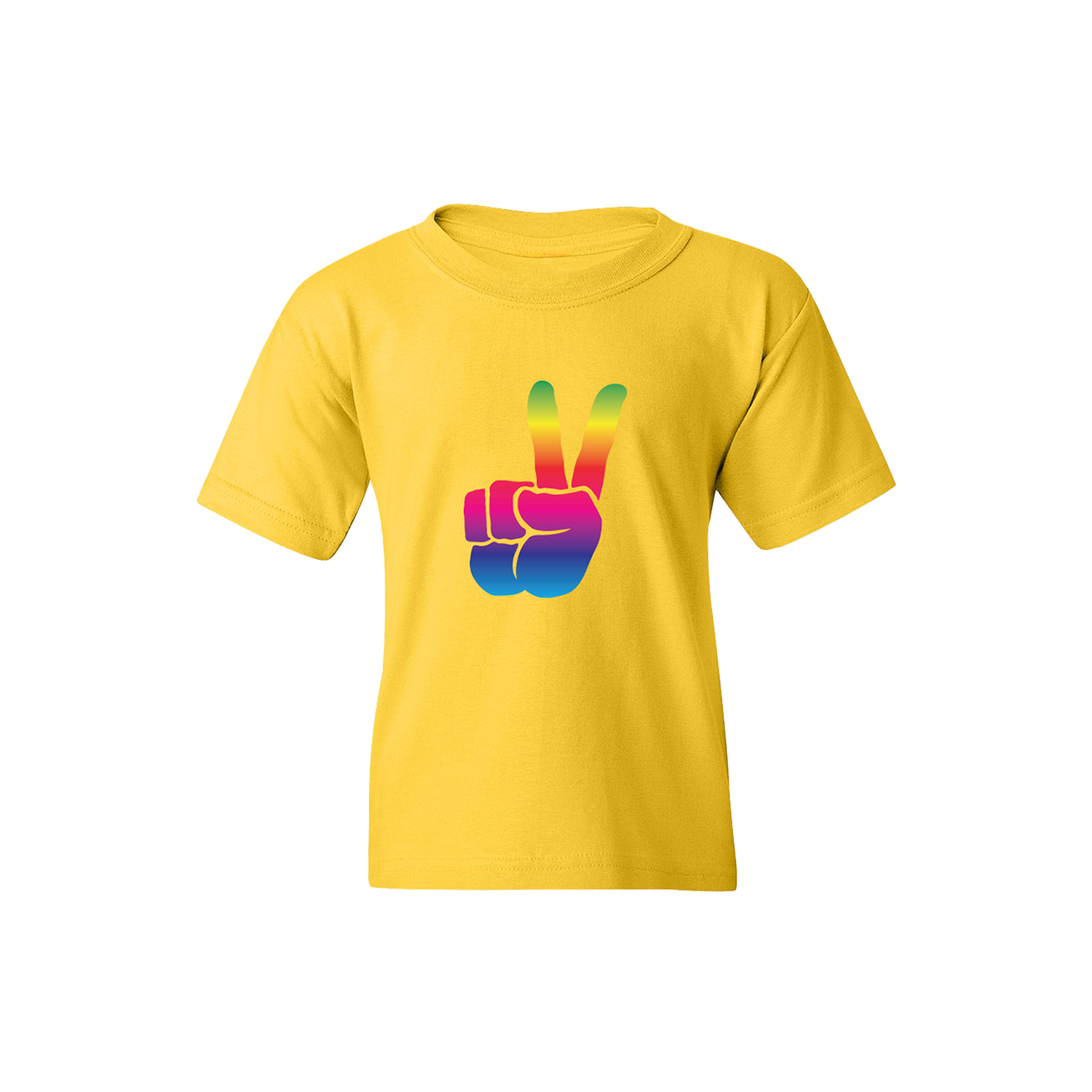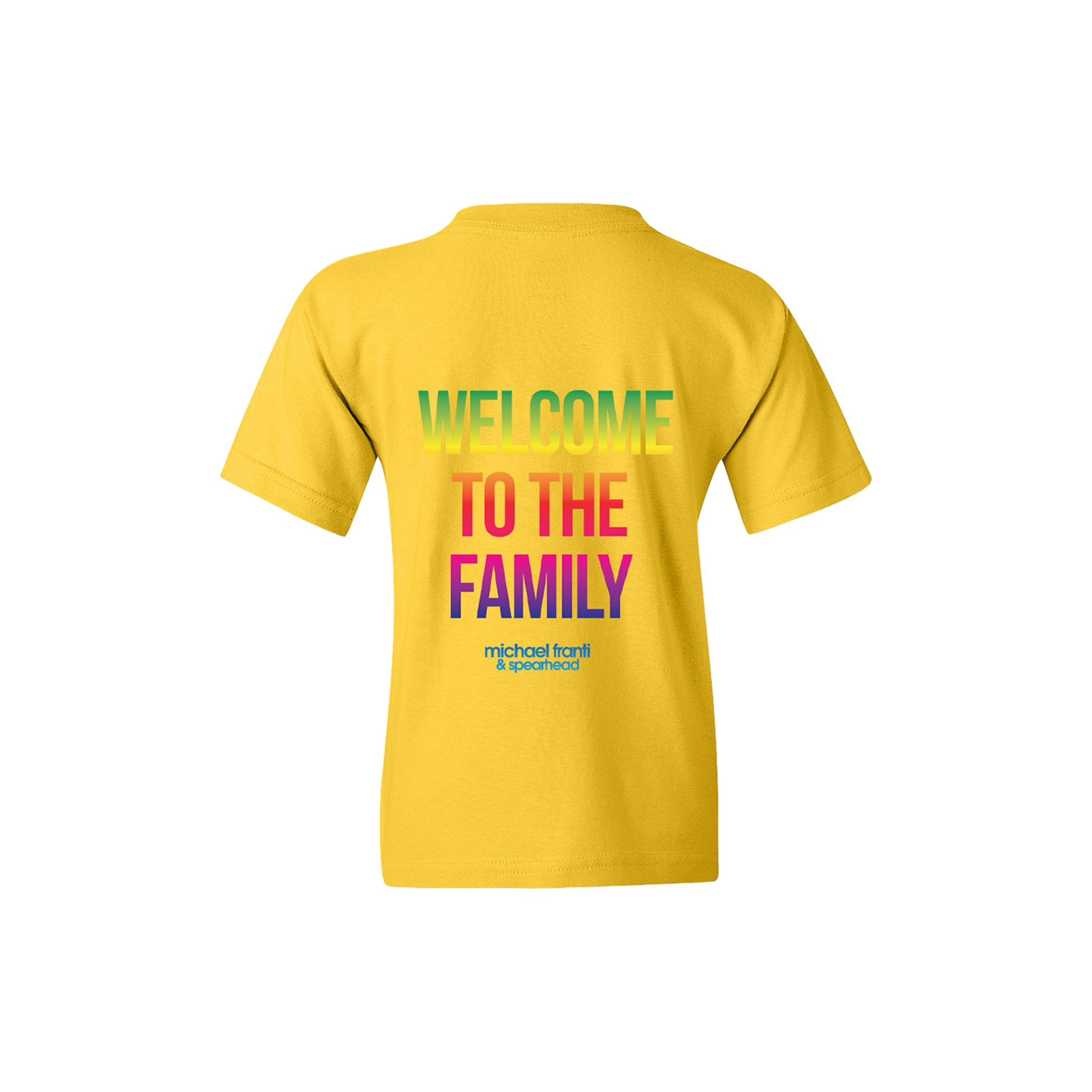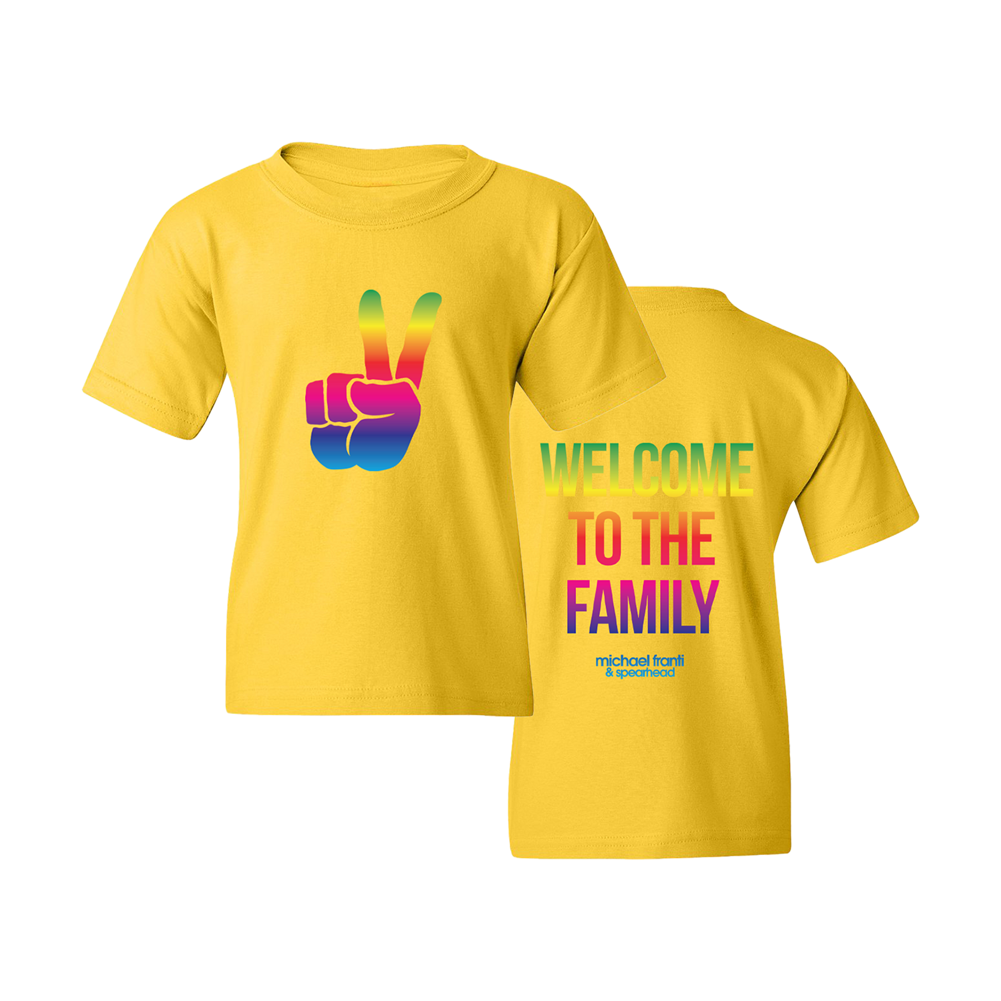 Premium 100% cotton yellow youth t-shirt with a rainbow gradient peace hand sign. The back features Welcome To The Family, the title of Michael Franti and Spearhead's new album in a matching rainbow gradient.